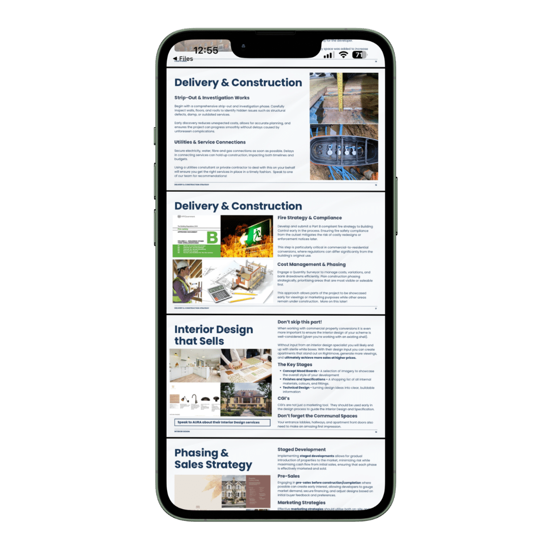 Theory is good, but results speak louder. The guide includes detailed case studies showing how developers turned underperforming offices, shops, and industrial buildings into profitable residential schemes.