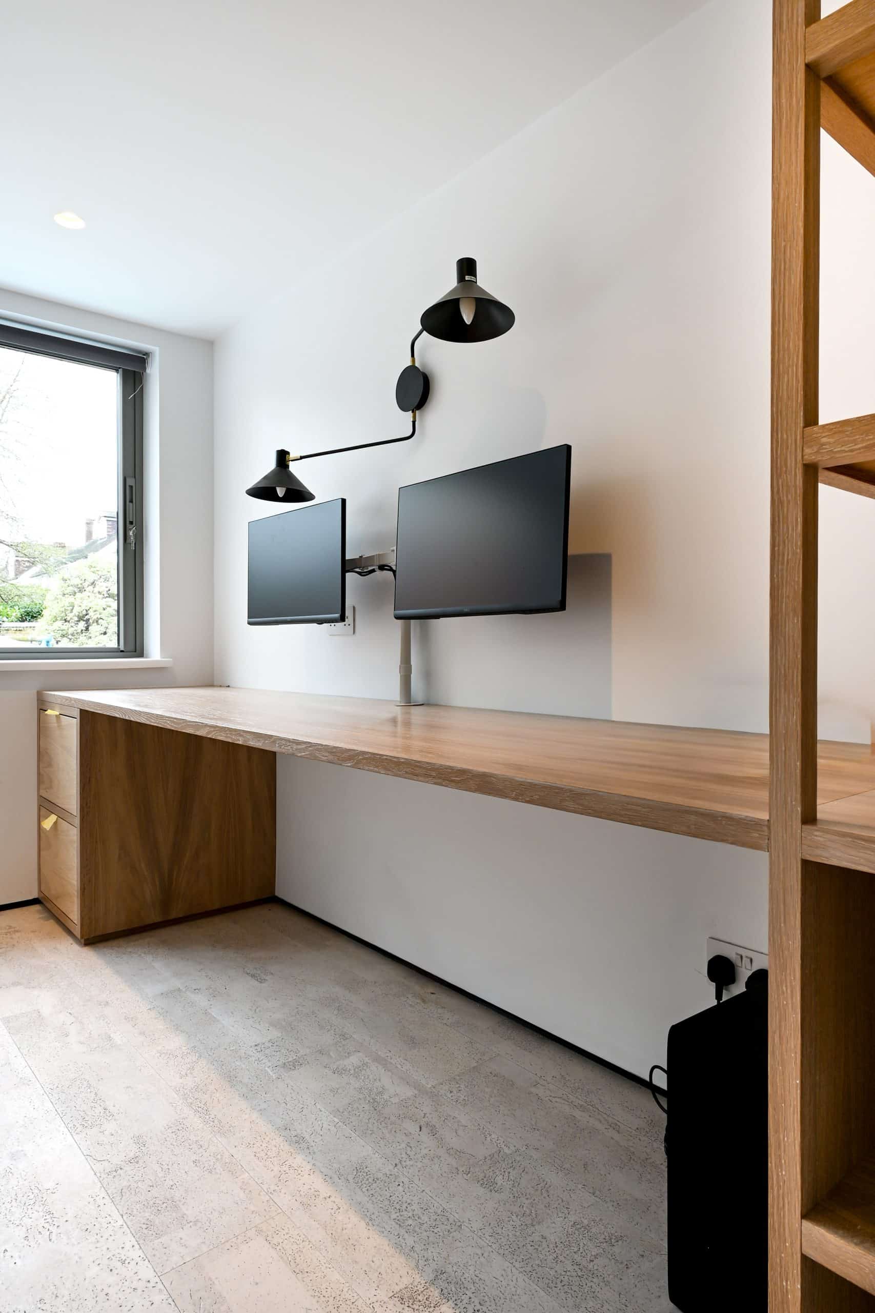 At ground floor level, the design introduces a single-storey rear extension alongside the removal of an underperforming conservatory and the conversion of the existing garage into internal living space. These interventions combine to create a generous, open-plan kitchen, dining, and living area, forming a cohesive and highly usable central space. To the front, the garage opening was reimagined with new glazing and cladding to improve both performance and appearance, while at first floor level, a discreet dormer extension above the garage provides additional accommodation in the form of a home office, designed to remain subservient to the main house.