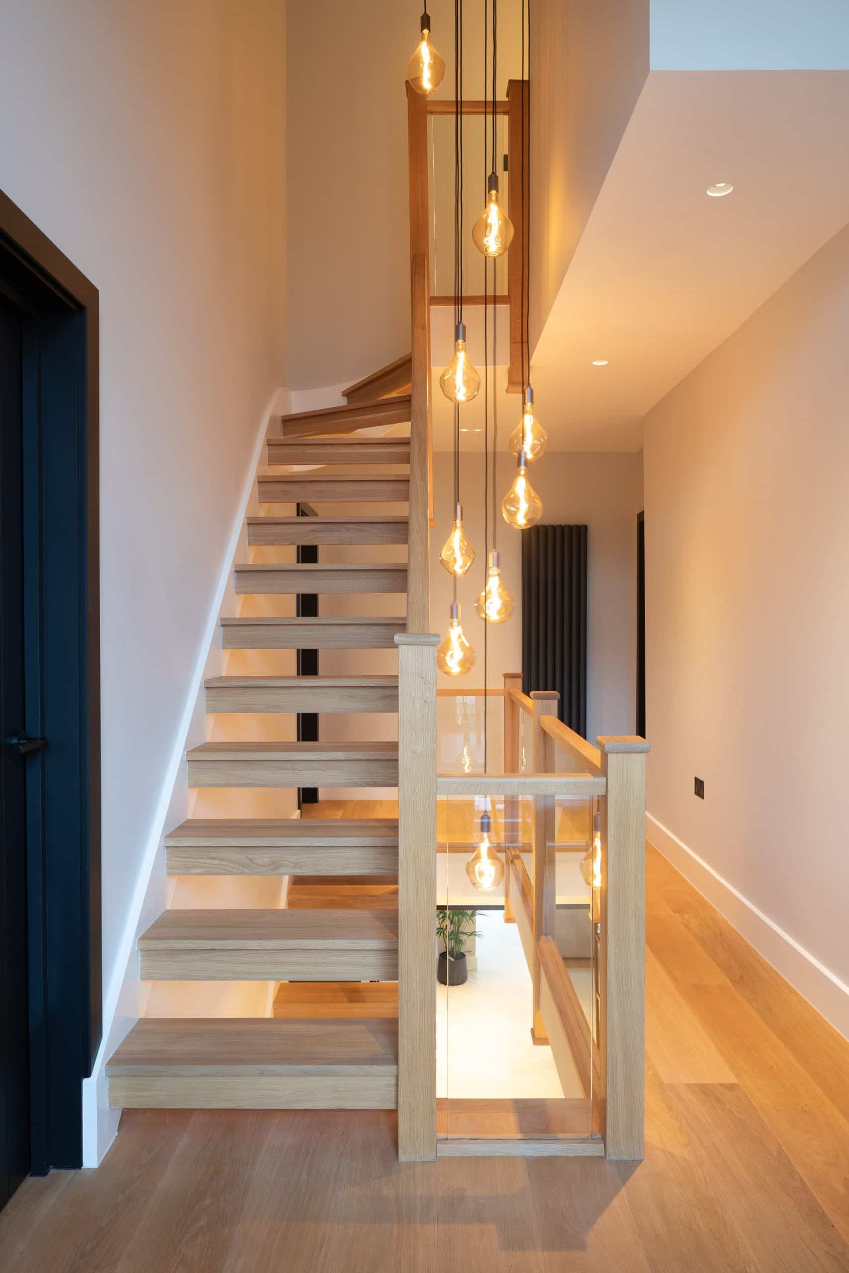 The transformation is most striking on the ground floor, where the old cellular rooms were replaced with a full-width kitchen, dining, and living space. A subtle step in the extension creates a natural courtyard effect, enhancing light and breaking up the long plan into distinct but connected zones. Practicality was just as important as aesthetics, which led to the creation of a dedicated home office, a children’s playroom, a utility and boot room linking front to rear, and even space for a compact gym tucked along the side. Thoughtful detailing — including full-height glazing, a redesigned staircase that drops daylight through every level, and a beautifully balanced materials palette — ensures the space feels calm, bright, and incredibly functional for family life.