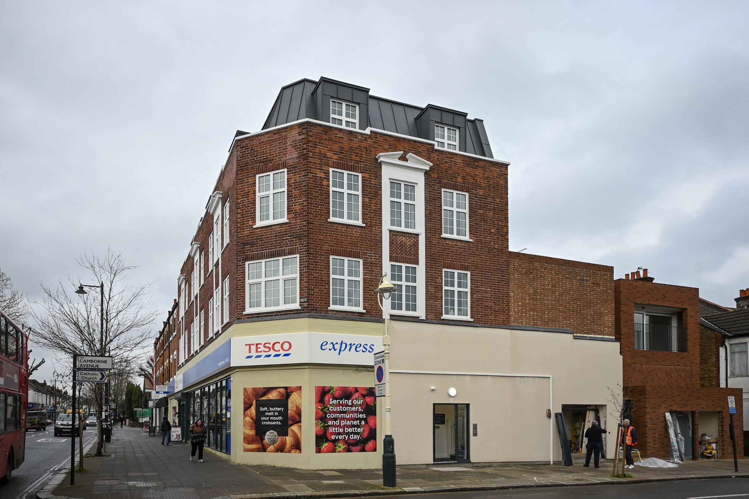 Located at 101–109 Northfield Avenue, this prominent corner building in Ealing occupies a key position at the junction of Northfield Avenue and Camborne Road, within a busy high street setting and close to excellent public transport links. The existing property comprised a 435 sqm Tesco food store at ground level with four two-bedroom flats above and ancillary office space used as staff accommodation.